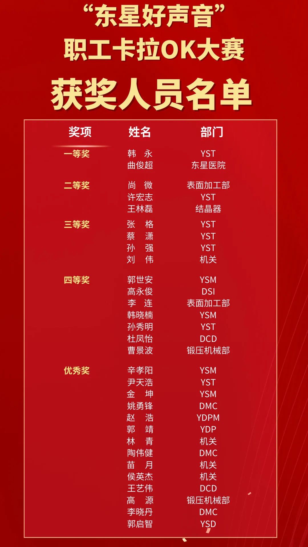 讓青春與熱情對話,讓歌聲與夢想放飛!為了打造健康文明、奮發(fā)昂揚的企業(yè)文化氛圍,豐富員工們的業(yè)余文化生活,深入挖掘集團公司優(yōu)秀藝術(shù)人才,展現(xiàn)東星職工的個人魅力與風(fēng)采,8月27日下午14:30,伴隨著動感的音樂和燈光秀,“東星好聲音”職工卡拉OK大賽決賽在煙臺開發(fā)區(qū)萬行廣場盛世華堂宴會酒店激情開唱。集團公司副董事長、副總經(jīng)理厲強,副總經(jīng)理王建全,總經(jīng)理助理宮明杰以及集團本部各單位和各長投單位的主管領(lǐng)導(dǎo)觀看了比賽。煙臺首鋼豐田工業(yè)空調(diào)壓縮機有限公司總經(jīng)理渡邊靖也親臨比賽現(xiàn)場為選手們加油助威。 本次大賽歷時近一個月的時間,共有來自15個單位的57名選手參加了海選。8月12日,集團公司工會在機關(guān)二樓會議廳組織了預(yù)選賽,在預(yù)賽的30名選手中,評選出16名晉級決賽。為了體現(xiàn)公開、公平、公正的辦賽原則,決賽特邀了5位在國家級、省市級各項音樂賽事中獲獎的專業(yè)評委現(xiàn)場在線評分,同步上傳至大屏幕,使參賽選手和觀眾們能夠第一時間了解到每位選手的得分情況。 音樂沒有國界,它可以穿越時空,跨越年代。在比賽現(xiàn)場,選手們的演唱曲目豐富多彩,從90年代的《新不了情》《刀劍如夢》到如今的當(dāng)紅流行歌曲《光年之外》《最美的太陽》;從唱出一名軍嫂內(nèi)心故事的《妻子》到鼓舞人心、令人向上的英文歌曲《You Raise Me Up》;從獨唱到樂隊伴奏演唱……選手們的表演風(fēng)格各異,精彩紛呈,不同時代的音樂就像時光穿梭機,帶領(lǐng)大家重溫經(jīng)典,感受時代的變遷。 鍛壓機械部 曹景波 《感謝》 表面加工部 李連 《站在草原望北京》 結(jié)晶器 王林磊 《最美的太陽》 YSM 韓曉楠 《終于等到你》 YSM 郭世安 《海闊天空》 YST 張格 《新不了情》 表面加工部 尚微 《妻子》 YST 蔡瀟 《刀劍如夢》 DCD 杜鳳怡 《恰似你的溫柔》 YST 孫秀明 《故鄉(xiāng)》 YST 許宏志 《領(lǐng)悟》 機關(guān) 劉偉 《YOU RAISE ME UP》 DSI 高永俊 《我是真的愛上你》 東星醫(yī)院 曲俊超 《千百年后誰還記得誰》 YST 孫強 《光年之外》 YST 韓永 《天邊》 最終,來自YST的韓永和東星醫(yī)院的曲俊超獲一等獎;尚微、許宏志、王林磊獲二等獎;張格、蔡瀟、孫強、劉偉獲三等獎;郭世安等7名選手獲四等獎;晉級預(yù)賽的辛孝陽等14名選手獲優(yōu)秀獎。出席活動的領(lǐng)導(dǎo)給獲獎選手們頒獎并合影留念。