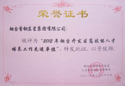 在近日召開的開發(fā)區(qū)勞資會議上,煙臺東星集團有限公司獲評煙臺經(jīng)濟技術開發(fā)區(qū)人力資源和社會保障局“2012年煙臺開發(fā)區(qū)高技能人才培養(yǎng)工作先進單位”榮譽稱號。