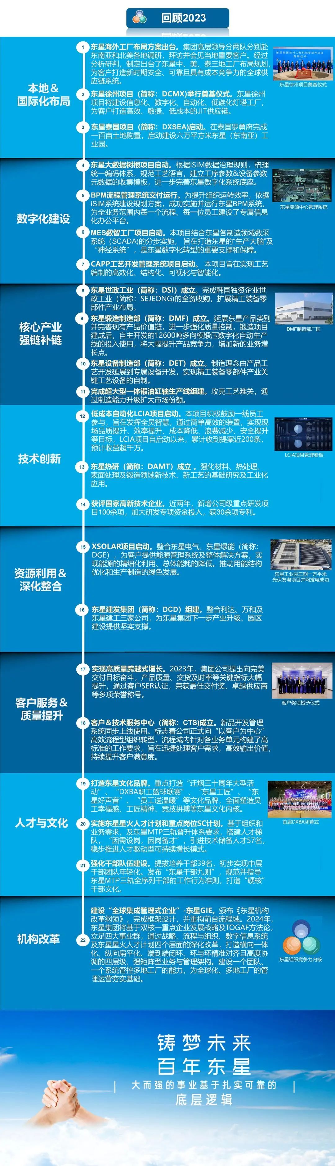 2023年,東星集團以“雙核一重點”戰(zhàn)略為指引,以R³TIM六項系統(tǒng)工作為抓手,全面推進(jìn)全球化、數(shù)字化、精益化、低碳化轉(zhuǎn)型,鑄造可以滿足全球市場競爭需求的敏捷、高效、可持續(xù)改進(jìn)的核心競爭力。