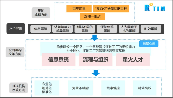 2022年以來,東星集團以“雙百工程”為目標,以“雙核一重點”戰(zhàn)略為指引,全面推進R3TIM六項系統(tǒng)工作,業(yè)務發(fā)展穩(wěn)步由“供應全球”向“全球供應”轉(zhuǎn)型。通過戰(zhàn)略、流程與組織、信息系統(tǒng)及東星星火人才四個層面的深化改革,逐步打破信息壁壘、時效低、認知與能力差異、利益不同、評價體系不同、人為因素干擾等帶來的六個影響組織效率的屏障,鑄造敏捷前臺、強系統(tǒng)強中臺、精簡集成共享的強支持后臺的核心競爭力,實現(xiàn)一個系統(tǒng)、一個團隊管控多地工廠,建設“全球集成管理式企業(yè)”-東星GIE。隨著機構(gòu)改革持續(xù)深入推進,目前已完成前臺組織CTS\DRDC\DAMT和強中臺組織CSCL\iSIM的搭建,多地子公司投入運行,公司對行政、人力資源等后臺部門的價值和效能提出了新的管理需求,后臺機構(gòu)改革勢在必行。