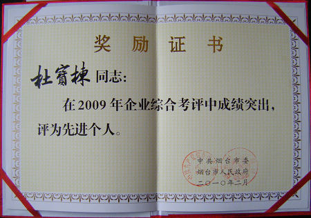 勵(lì)。 我公司憑借優(yōu)異的經(jīng)營(yíng)業(yè)績(jī),在“企業(yè)綜合考評(píng)先進(jìn)集體和先進(jìn)個(gè)人”獎(jiǎng)項(xiàng)中,被煙臺(tái)市委、市政